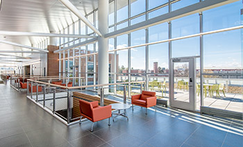 The building is the home for the University’s programs in nursing, public health and communication disorders. A combination of general academic classrooms, nursing simulation labs and academic offices are anchored by a café, collaborative spaces, and a three-story open-glass atrium. The University’s Speech and Hearing Clinic, which provides a full range of diagnostic and therapeutic services for the community, is located on the lower level.