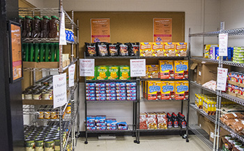 The pantry, located in Room 335 of the Student Center, is stocked with non-perishable groceries such as pasta, rice, cans of soup, canned fruits and vegetables, cereal, granola bars, crackers, coffee, and tea.
