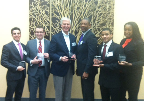 The team included (from left): Nicholas Cruz, Jared Helenic, Professor Timothy Werkley, Ronald Jones (coach), Matthew Alston, and Ashley Marfo. On an individual basis, Henenic reached the semi-finals and Cruz won the Pressure Round competition.